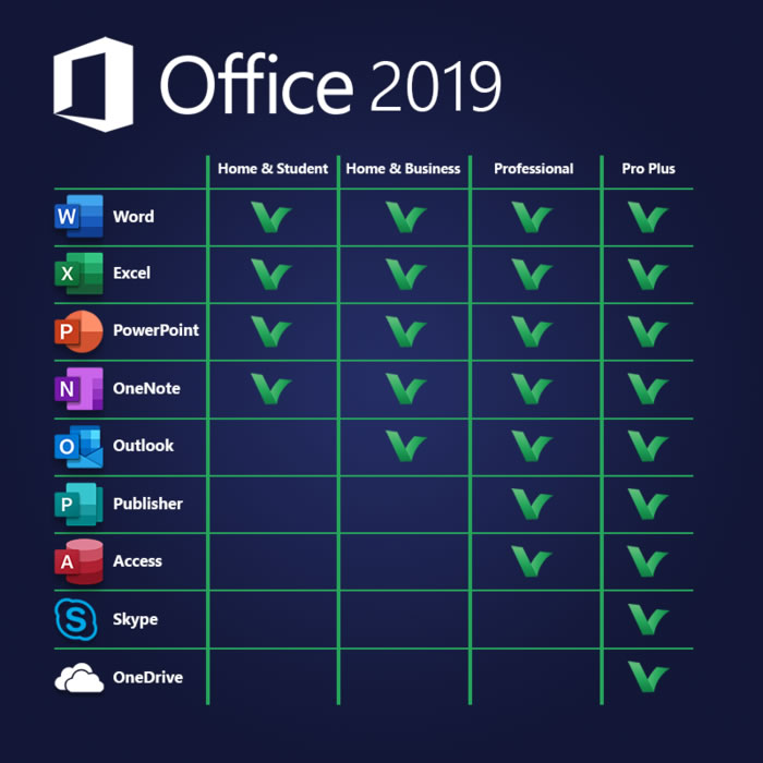 - Office Professional Plus 2019 is a Lifetime licensed to 1 machine which includes Access, Excel, Outlook, PowerPoint, Publisher, Word, and Skype for Business.